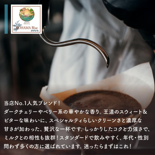 〈Kohama Blue〉 当店の1番人気!香りはダークチェリーやベリー系のフレーバー、テイストは王道のスウィート&ビター 昔ながらのクラシックなビターテイストを踏襲しながらも、スペシャルティらしいクリーンさと 濃厚な甘さが魅力のブレンドです。 力強さや濃厚さもあるブレンドですのでミルクビバレッジでお使いいただくのにもおすすめのコーヒーです。 スタンダードなお味のブレンドですので、年代性別問わず幅広いお客様からご好評をいただいております。 ⚫︎この返礼品は令和5年度の竹富町特産品として認定されています。 ☆お店の味わいを自宅で!ハンドドリップの美味しい淹れ方☆(1人分) (1)コーヒーの粉約15gをドリッパーにセット(粉の挽き目は中細挽き) (2)蒸らしのお湯(20g?30g)を投入して30秒待つ (3)コーヒー粉の中心からコーヒードームを膨らませていくイメージで少しずつ本抽出を開始 (4)本抽出で200gぐらいのお湯を加えたら完成 〈ポイント〉 お湯の温度は90℃?95℃が最適! 抽出の際、ペーパーフィルターに直接お湯がかかると味が薄まってしまうので、コーヒードームの内側だけにお湯を注ぐようにしましょう ※直射日光および高温多湿を避けて保存してください ※開封後はお早めにお召し上がりください