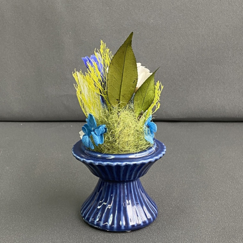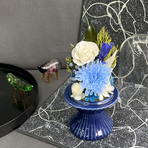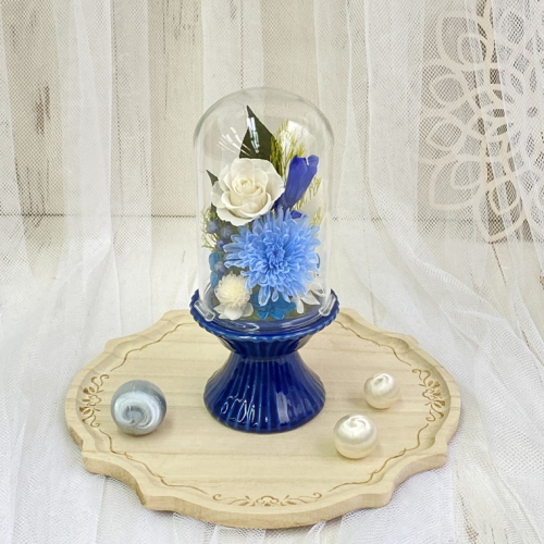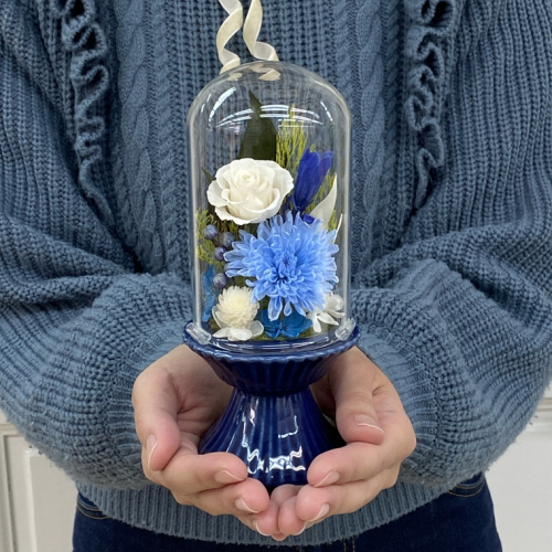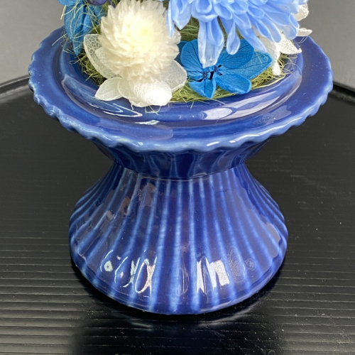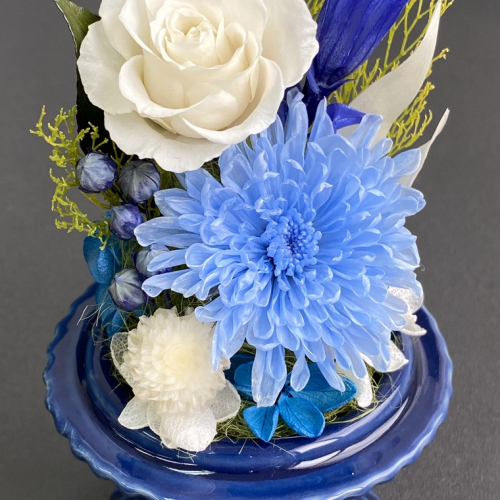 藍色の陶器製花器に白と青を基調とし、珍しいリンドウを使用した、上品なガラスドーム付きの仏花です。