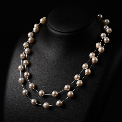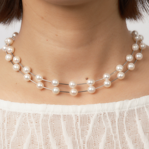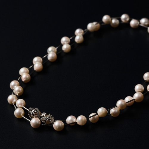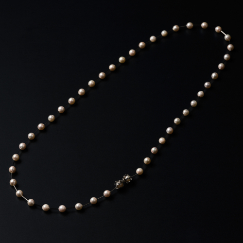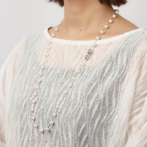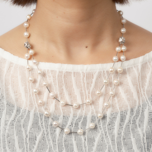 真珠と真珠の間に細身のパイプをつなぎ、間を開けることで、真珠による華やかさと涼し気な上品さを兼ね合わせたネックレスに。