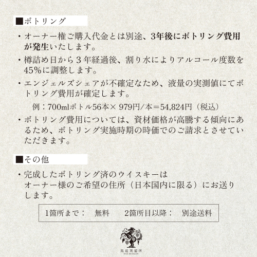 ・完成したボトリング済のウイスキーはオーナー様のご希望の住所(日本国内に限る)にお送りします