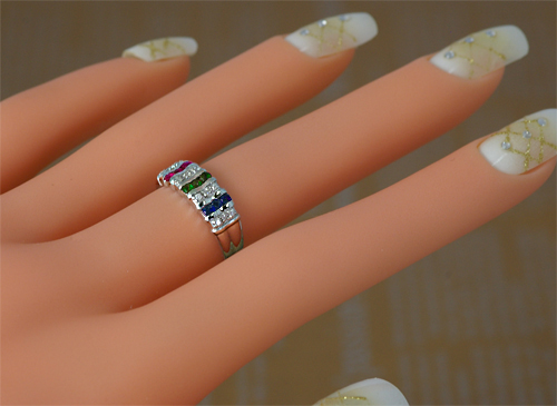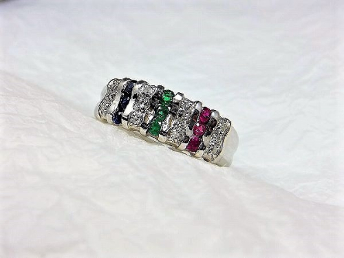 0.1カラットの高品質のルビー、エメラルド、サファイアの間に、ダイヤモンドをセッティングした赤、緑、青、白のコントラストがとても美しいゴージャスなデザインのリングです。