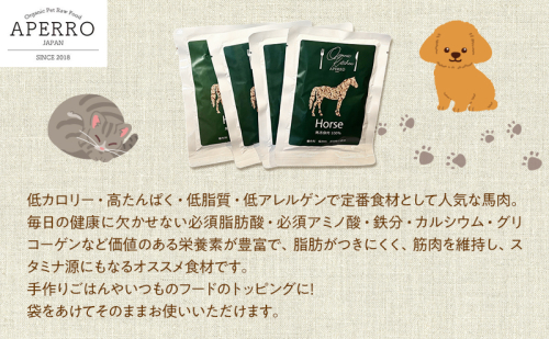 低カロリー・高たんぱく・低脂質・低アレルゲンで定番食材として人気な馬肉。 毎日の健康に欠かせない必須脂肪酸・必須アミノ酸・鉄分・カルシウム・グリコーゲンなど価値のある栄養素が豊富で、脂肪がつきにくく、筋肉を維持し、スタミナ源にもなるオススメ食材です。 手作りごはんやいつものフードのトッピングに!袋をあけてそのままお使いいただけます。