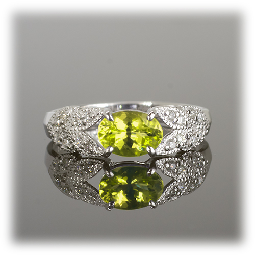0.6カラットのカナリートルマリンを可愛いらしく、アンティークな雰囲気の枠に横置きに留めました。