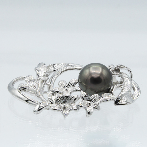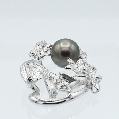 11mmのセミラウンドタヒチ産黒真珠をあしらい、花のモチーフの地金が上品に彩るエレガントなデザイン。