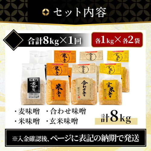 No.273-B 味噌詰合せ(麦みそ、合わせみそ、玄米みそ、米みそ各2kg、合計8kg) 国産 九州 味噌 みそ 保存料・酒精等無添加 調味料 麹 こうじ 味噌汁 みそ汁 調味料【はつゆき屋】