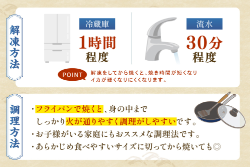 冷蔵庫で1時間程度、または流水で30分程度の解凍をしてから焼くと、焼き時間が短くなりイカが硬くなりにくくなります。