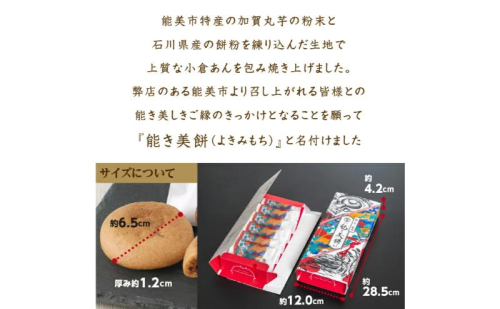 【配送不可:北海道、沖縄、離島】 能美市特産の加賀丸芋の粉末と石川県産の餅粉を練り込んだ生地で上質な小倉あんを包み焼き上げました。『もちもち』とした生地の食感が特徴の焼菓子となっております。弊店のある能美市と、お召しになる皆様との能(よ)き美しきご縁のきっかけとなることを願って『能き美餅(よきみもち)』と名付けました。