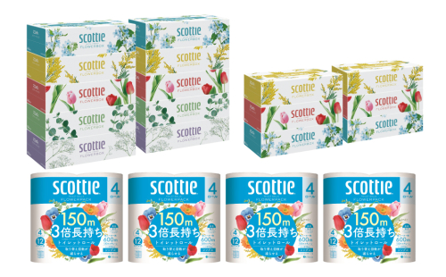 - 【定期便6回】【毎月お届け】【スコッティ】 ティシュー フラワーボックス 250組(5箱パック×2セット・3箱パック×2セット)+フラワーパック 3倍長持ち(4ロール(シングル)パック×4セット)ティッシュ トイレットペーパー 日用品 ストック