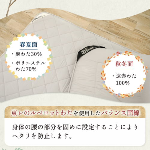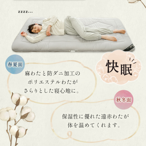 春夏面は麻わたと防ダニ加工のポリエステルわたがさらりとした寝心地を、秋冬面は保湿性に優れた遠赤わたが体を温めてくれます。