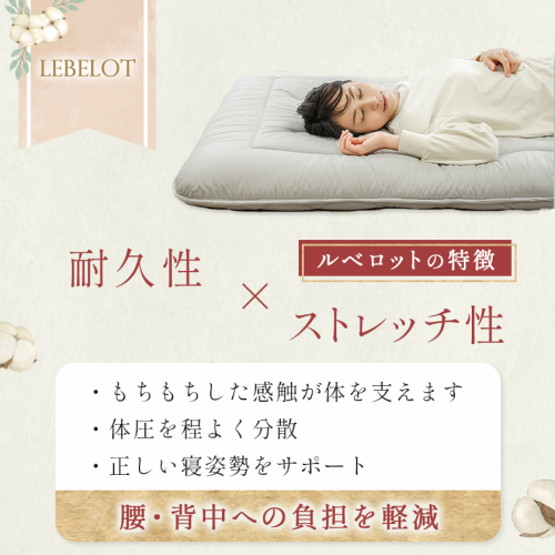 ※ルベロットわたの特長:耐久性とストレッチ性があり、もちもちした感触が体を支えます。