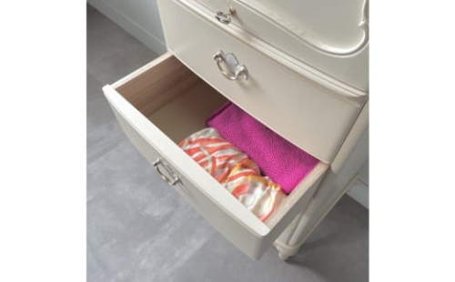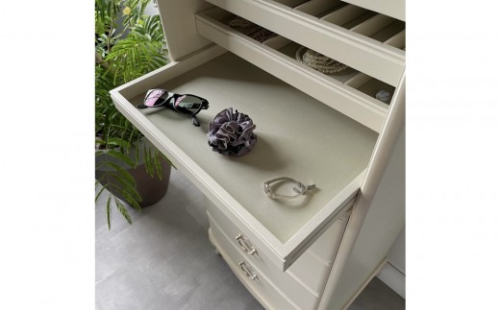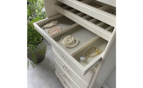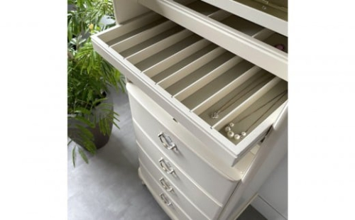 上段4段の引き出しには それぞれ仕切りがついており、ジュエリー、時計、メガネなどのアイテムを見やすくに収納できます。