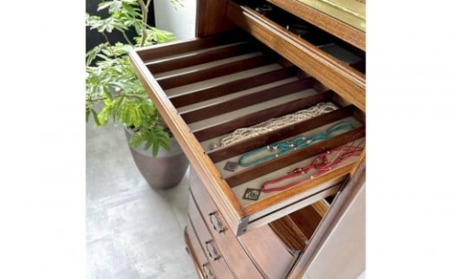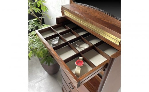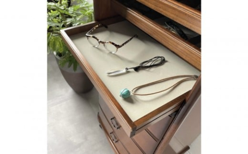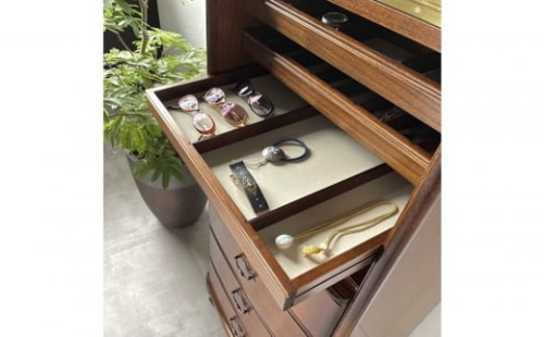 上段4段の引き出しには それぞれ仕切りがついており、ジュエリー、時計、メガネなどのアイテムを見やすくに収納できます。