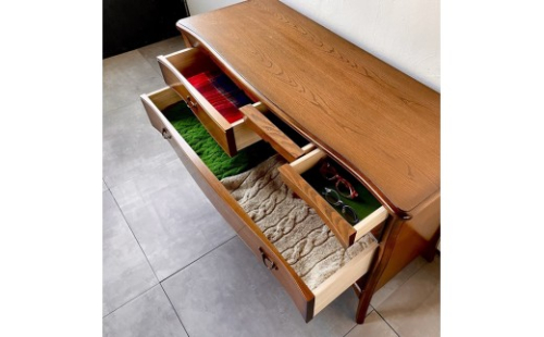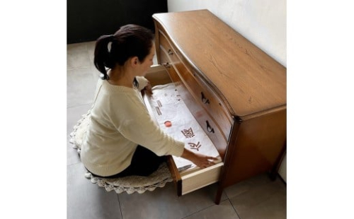 上段の小引き出しは底板にフェルトが敷かれている為、小物やアクセサリーなどを大切に収納出来て便利です。また、引き出しが広い為、たとう紙に包んだお着物も、そのまま保管できるサイズです。