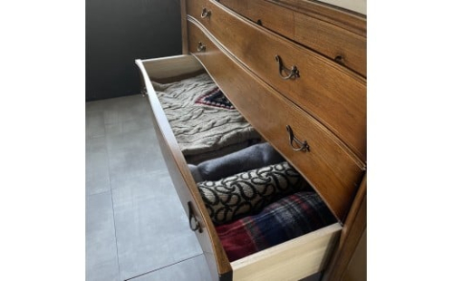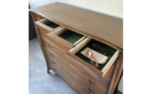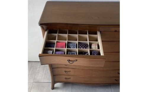 仕切り板の入った引き出しは小物などを綺麗に収納できます。引き出しが広い為、たとう紙に包んだお着物も、そのまま保管できるサイズです。引き出しの開閉もスムーズで使い勝手もよく、収納力もある美しいフォルムの魅力的なチェストです。