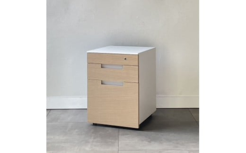 デスクに合わせて作られたキャスター式ワゴンは、収納力も高く トップトレイは鍵付きです。