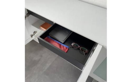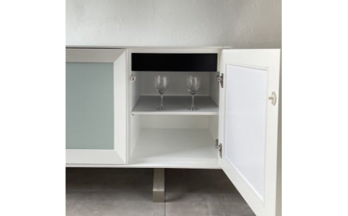 各扉内は 可動式の棚板1枚と、小物などを収納できる引き出し1杯がついています。扉のテーパー面が美しい陰影を生み出すサイドボードN180、リビングルームやプライベートルームの収納に最適なアイテムです。