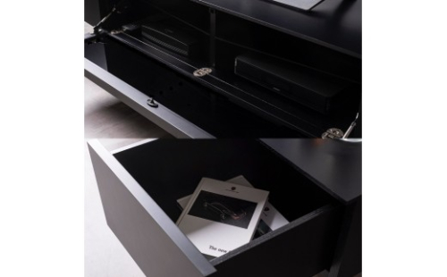 中央の収納は ガラス棚付きのデッキ等の収納スペース、両サイドは 引き出しの大容量収納となっています。赤外線を通しますので、リモコンもお使いいただけます。