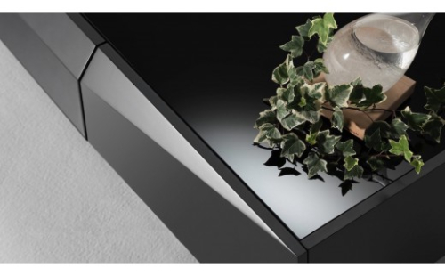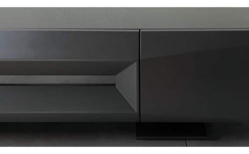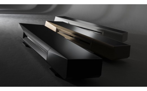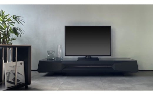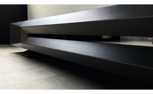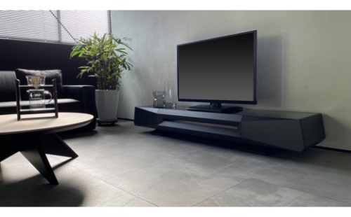 大胆な面構成とダイナミックなフォルムが彫刻的な存在感を演出した、立体的でメカニックなデザインが特徴のテレビボードです。