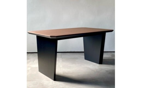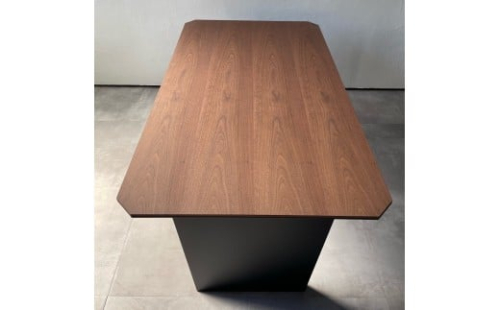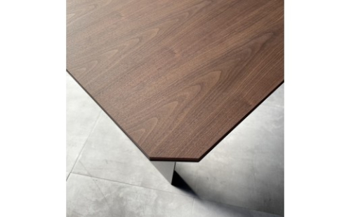 ウォールナットの板目が柔らかな表情の天板は、四方を切り落とした変形形状の面を取ることで、シャープさと立体感を醸し出しました。