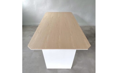 天然オークの板目の天板は、四方を切り落とした変形形状の面を取ることで、シャープさと立体感を醸し出しました。