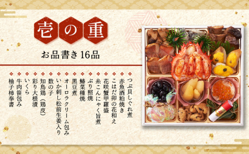つぶ貝しぐれ煮、赤魚酒粕焼き、こはだ卯の花和え、花咲蟹甲羅盛、糸こんにゃく旨煮、ぶり照焼、鰆菜種焼、黒豆煮、オーロラクリーム包み、いか刺し松前生姜入り、数の子、知鳥鶏(鶏皮)、彩り大根漬、いくら 、牛肉笹包み 、柚子柿奉書