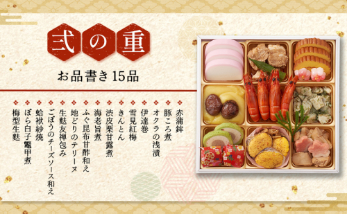 赤蒲鉾、豚ころ煮、オクラの浅漬 、伊達巻、雪見紅梅、きんとん、渋皮栗甘露煮、海老旨煮、ふぐ昆布甘酢和え、地どりのテリーヌ、生麩友禅包み、ごぼうのチーズソース和え、蛤袱紗焼、ぼら白子鼈甲煮、梅型生麩