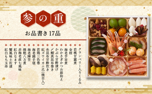 クランベリー入りくるみ、若桃甘露煮、金柑 、海老芋旨煮、わかさぎかつお節和え、かぶら甘酢漬け、〆鯖真昆布巻き、糸昆布甘酢炊き、紅ズワイカニ爪(焼目入)、若鶏三色巻、海老錦手毬、海老陣笠、焼麩八方煮、赤海老直七風味、紅白なます、蟹風味土佐漬、紅白もち玉串