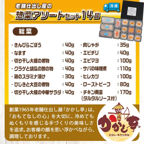 1965年に創業した老舗仕出し屋「かかし亭」が作る、14種類のお惣菜をお楽しみいただけるセットです。