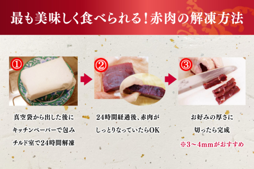 赤肉がしっとりしているのを確認した後、お好みの厚さにスライスしてお召し上がりください。
