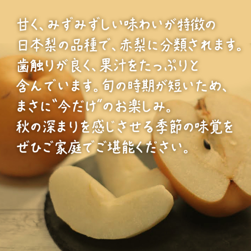 甘く、みずみずしい味わいが特徴の日本梨の品種で、赤梨に分類されます。