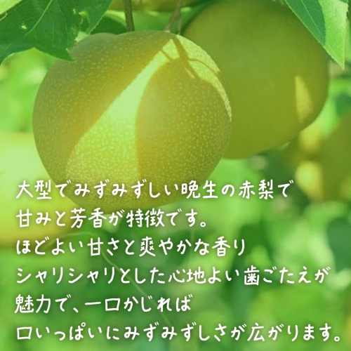 大型でみずみずしい晩生の赤梨で、甘みと芳香が特徴です。