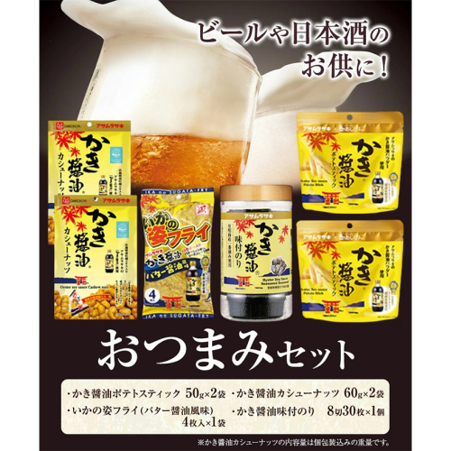 - おつまみセット かき醤油ポテトスティック かき醤油カシューナッツ いかの姿フライ(バター醤油風味) かき醤油味付のり 詰め合わせ セット 株式会社アサムラサキ《30日以内に出荷予定(土日祝除く)》岡山県 笠岡市 送料無料 牡蠣 カキ 海苔 味付海苔