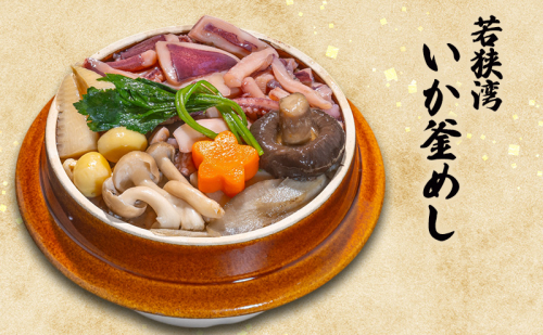 地元名産品を使った冷凍本格釜めし2種(若狭湾いか、焼き鯖)。福井県の嶺南地域には御食国(みけつくに)や鯖街道(さばかいどう)など地魚にまつわる歴史が沢山あります。御食国とは、日本古代から平安時代まで、新鮮な海水産物などの食料を朝廷に献上する役割を担っていた国のことです。