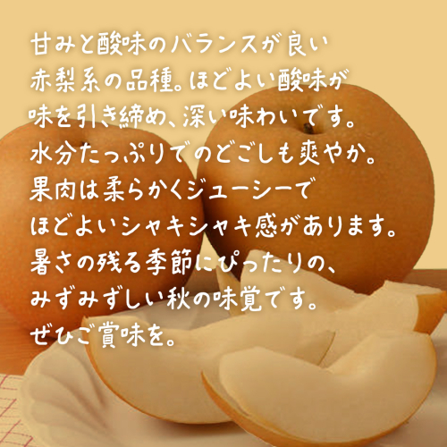甘みと酸味のバランス良し!柔らかジューシーがお好みの方へ! 甘みと酸味のバランスが良い赤梨系の品種。 ほどよい酸味が味を引き締め、バランスのとれた深い味わいです。 水分たっぷりでのどごしも爽やか。 果肉は柔らかくジューシーでほどよいシャキシャキ感があります。 暑さの残る季節にぴったりの、みずみずしい秋の味覚です。 ぜひご賞味を。 (茨城県共通返礼品:大子町) 【内容量】 約10kg (16~28玉) ※サイズや入数はご指定いただけません 【消費期限】 発送から4日間 【保存方法】 冷蔵保存 【申込期日】 2026年9月15日入金確認分まで 【発送期日】 冷蔵配送 2026年9月上旬頃より収穫後、発送開始。 入金確認後、お申込み順に順次発送予定。 ※生育状況により、前後する場合がございます。 ※クール便対象 配送できない地域がございます※   ・伊豆諸島:青ヶ島村(青ヶ島)・利島村(利島)・御蔵島村(御蔵島)・式根島 ・小笠原諸島:小笠原村(父島・母島・硫黄島・南鳥島など) 【商品提供】 マコファーム 【注意事項】 ※画像はイメージです。 ※梨の玉数はご指定頂けません。 ※到着後はできる限りお早めに、お召し上がり下さい。 ※天候や育成状況等により、やむを得ず配送時期の変更や、他の品種に代えさせていただく場合がございます。 ※ご不在など受取に時間がかかった事が、原因と思われる傷み等に関しての再送は対応しておりません。ご理解・ご了承の程よろしくお願いいたします。 地場産品類型:8-ロ 類型該当理由:茨城県の共通返礼品であるため。
