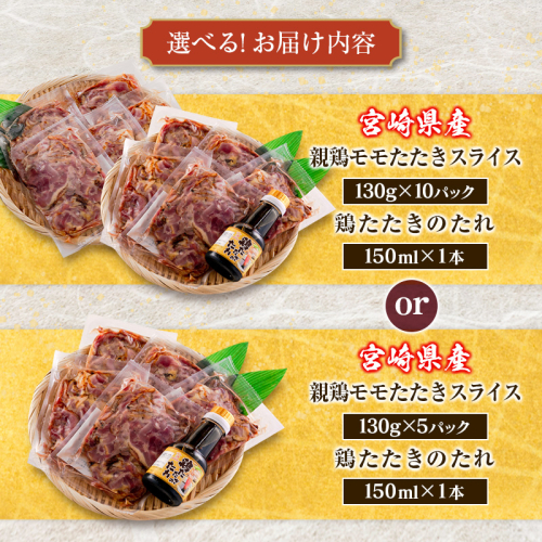 <選べる容量> 国産 鶏たたきスライス&タレ付 130g(5or10パック) 親鶏もも肉 鶏肉 タタキ 鳥刺し 小分けパック 数量限定 宮崎県新富町産【A301-A340】
