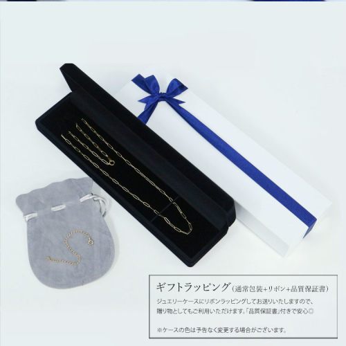 定番デザインのあずきチェーンに、ひとつひとつのコマを少し長めにアレンジしたタイプ。書類を留めるクリップによく似ているため、ペーパークリップチェーンとも呼ばれています。軽やかな着け心地ながら、しっかりとした存在感を備えており、コーディネートに程よいボリュームをプラスします。