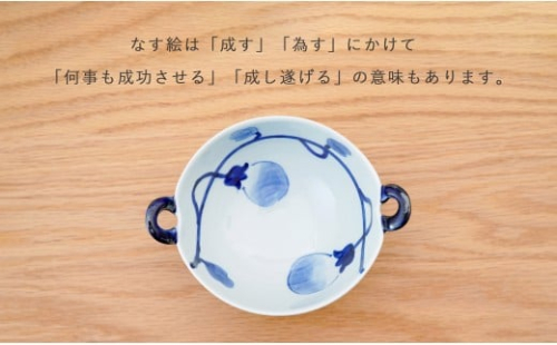 - 有田焼 皓洋窯 なす絵 耳付 スープ碗 2色 セット【藍土】食器 器 うつわ 小鉢 ボウル スープ碗 スープカップ なす 染付 ペアセット 30000円 3万円 A30-810