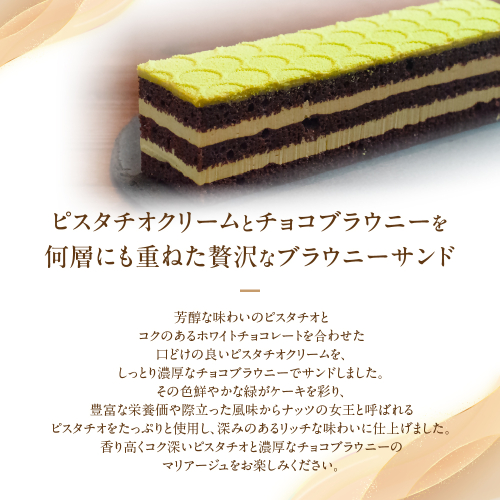 芳醇な味わいのピスタチオとコクのあるホワイトチョコレートを合わせた口どけの良いピスタチオクリームを、しっとり濃厚なチョコブラウニーでサンドしました。