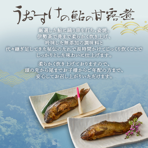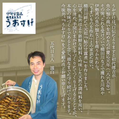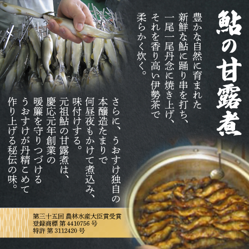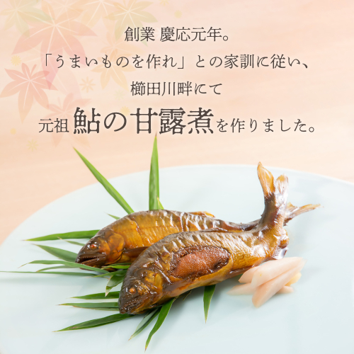 創業慶応元年。「うまいものをつくれ」の家訓にしたがい櫛田川のたもとにて「元祖鮎の甘露煮を創り上げました。厳選した鮎に踊り串を打ち姿焼をし、伊勢茶で骨まで柔らかく炊き上げた後、吟味した無添加の調味料と代々継ぎ足してきた秘伝のたれで長時間かけてじっくり炊くことでしっかりとした味わいに仕上げます。そしてこの伝統は、六代目へと引き継がれます。