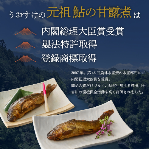 うおすけとして内閣総理大臣賞を、元祖鮎の甘露煮としても農林水産大臣賞等、数々の受賞歴があり、高い評価をいただいています。