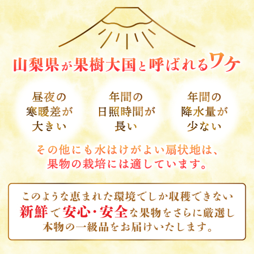 山梨県が果樹大国と呼ばれるか、その理由といたしまして、昼夜の寒暖差が大きい、年間の日照時間が長い、年間の降水量が少ない、などがあげられます。