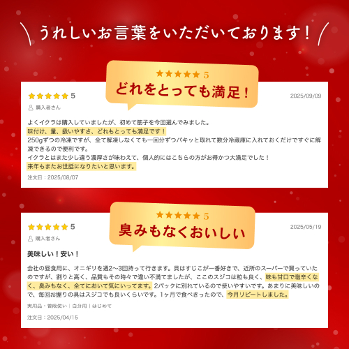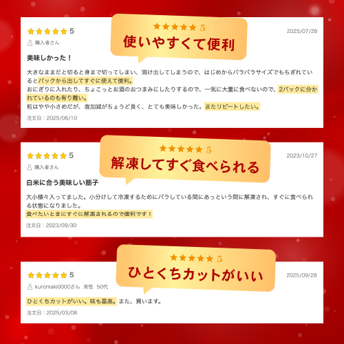 筋子を食べやすいひとくちのサイズにカットしてありますので、解凍後すぐにお召し上がりいただけます。