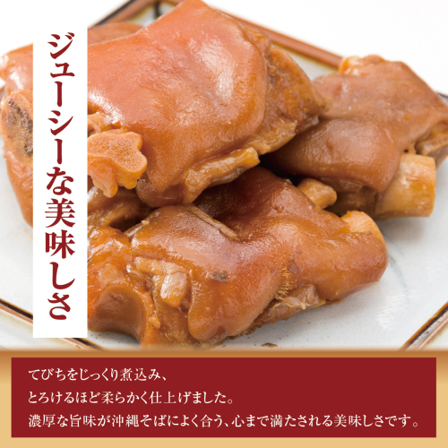 おなじみのてびちは「豚足」で、沖縄ではおでんや煮付けなどでも食されています。 玉家のてびちはそば出汁でじっくり煮込み、コラーゲンたっぷり! プルプルとした食感はやみ付きになる1品です。 第2回沖縄そば王 受賞 【対応が出来ないこと】 ・発送の事前連絡、発送後の報告のご希望はお受けしておりません。 ・日付や曜日のご指定は出来ません。 ・のし、ラッピング等のギフト(お中元)対応は行っておりません。 【お届けに関して】 ・不在日や受取不可日がある場合、お申し込み時に備考欄のメッセージにご入力ください。 ※不在日、受取不可日の事前連絡がなく、寄附者様都合によりお受取頂けない場合の再発送は致しかねます。 ・お申込み後に不在日や、受取不可日が発生した場合、改めてご連絡をお願いします。 ※尚、ご連絡が出荷時期に差し掛かっていた場合、内容によっては対応が出来ない場合があります。 【その他 注意事項】 ※商品到着後すぐ、現物の確認をお願いいたします。  お時間が過ぎてからの対応は致しかねます。 ※掲載画像はイメージです。 ※※ 必ずお読みください ※※ ■荷物お届け時のご不在に関して ・運送会社ルールに基づき、常温の荷物は3日目、クール・生ものは2日目まで配達対応いたします。それ以降は配達をせず到着店にて保管となります。 ※保管期限は、最大1週間となります。 ・保管期限内(最大1週間)にお受け取りいただけなかった場合、沖縄へ返送となりますのでご注意ください。 ・保管期限内でお受け取りいただけず、沖縄返送後の再発送は承れません。
