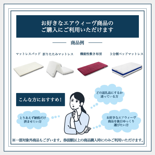 ![エアウィーヴ ギフト券(5万円分)【エアウィーヴオンラインストアで使える】[エアウィーヴ エアウィーブ 寝具 人気 おすすめ 割引 チケット クーポン ギフト 商品券 優待券 プレゼント 割引券] 2232543 - 福岡県大刀洗町](/upload/save_image/2232543_image_1_l.jpg)