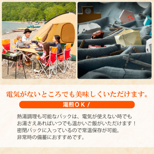 熱湯調理も可能なパックは、電気が使えない時でもお湯さえあればいつでも温かいご飯がいただけます。