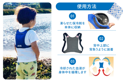 ※ 使用方法は、凍らせた保冷剤を本体に収納し、背中上部に背負うように装着します。