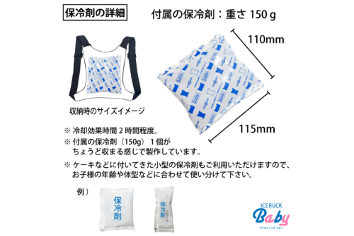 「アイスリュック Baby」に付属する専用保冷剤は150gですが、お子様の体型に合わせて小型の保冷剤※1もご使用いただけます。