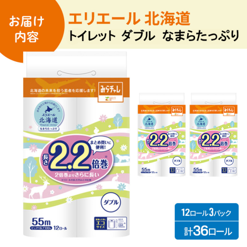 - エリエール 北海道トイレット ダブルなまらたっぷり2.2倍巻 12ロール×3パック/計36ロール