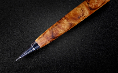天然木の温もりと個性光る銘木の杢目を手作り文房具と融合し、その手触り感と素晴らしさを感じて頂きたい。 【形状】手持ち部分膨らむタイプ 【芯径】0.5 【タイプ】ノック式シャープペン ■返礼品の地場産品基準■ 区域内にて原材料を仕入れ、裁断、整形、加工を行い、梱包から出荷まですべての工程を行うことにより相応の付加価値が生じているため。