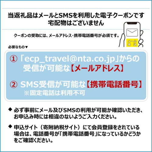 必ず事前にメール及びSMSの利用が可能か確認いただき、お申込み時には相違のないようご入力ください。また、申込サイトにて会員登録をされている場合は、電話番号が「携帯電話番号」になっているかどうかをご確認ください。